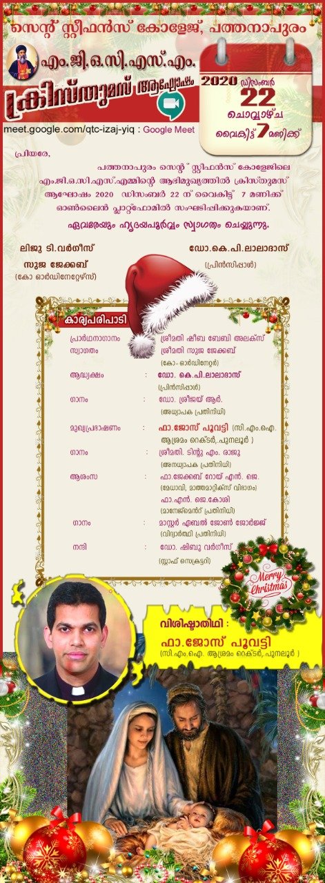 The Celebrations of the College organised by M.G.O.C.S.M is to be held on 22nd December 2020 at 7 p.m via google meet . Rev.Fr. Jose Poovatty CMI, Rector,Punalur Ashram will deliver the Christmas Message. All are invited to the programme.