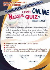IQAC & Department of Economics,St.Stephen's College, Pathanapuram, Kerala is conducting a National Level online quiz on Indian Economy on 29th and 30th June, 2020. We cordially invite you to participate in the Online Quiz programe. For clarifications, email us at ssceconomicshod@gmail.com
