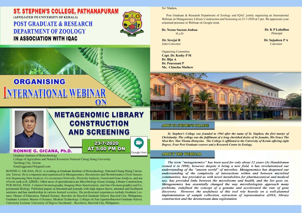 Greetings from St. Stephen's College, PathanapuramPost Graduate Department of Zoology & IQAC invite you all to International National Webinar on "