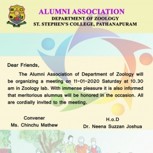 The Alumni Association of Department of Zoology will be organizing a meeting on 11/01/2020, Saturday at 10.30 am in Zoology Lab. Meritorious alumnus will be honored in the occation.