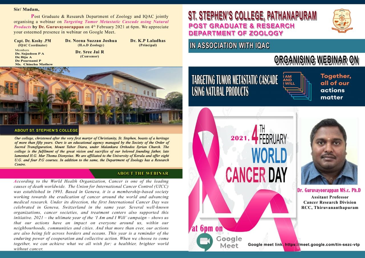 Post Graduate and Research Department of Zoology and IQAC jointly organizing a Webinar on "Targeting tumor metastatic cascade using natural products" by Dr. Guruvayoorapan, Assistant Professor , Cancer Research Division,RCC., TVM on 4th February,2021 at 6 PM. Brochure